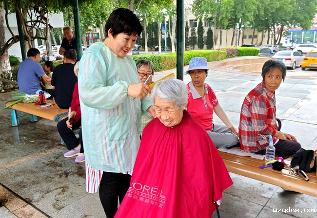 图为志愿者为居民义务理发。
