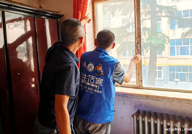 图为社区工作人员为独居老人更换破损窗纱。